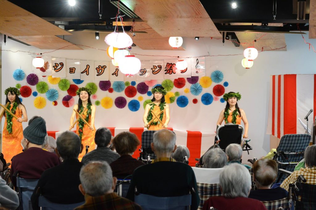 ⭐「ラウレアアロハ」の皆様によるフラダンス。色鮮やかな衣装と、ゆったりとした優しい動きや南国を感じさせる音楽に、入居者様も自然と笑顔に。