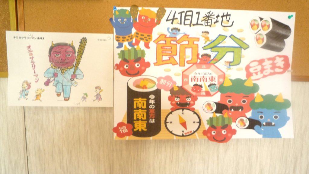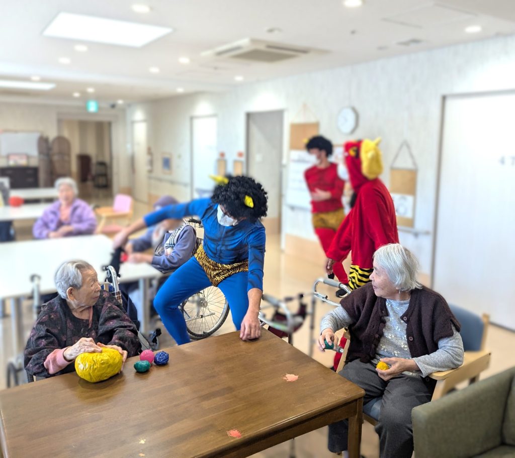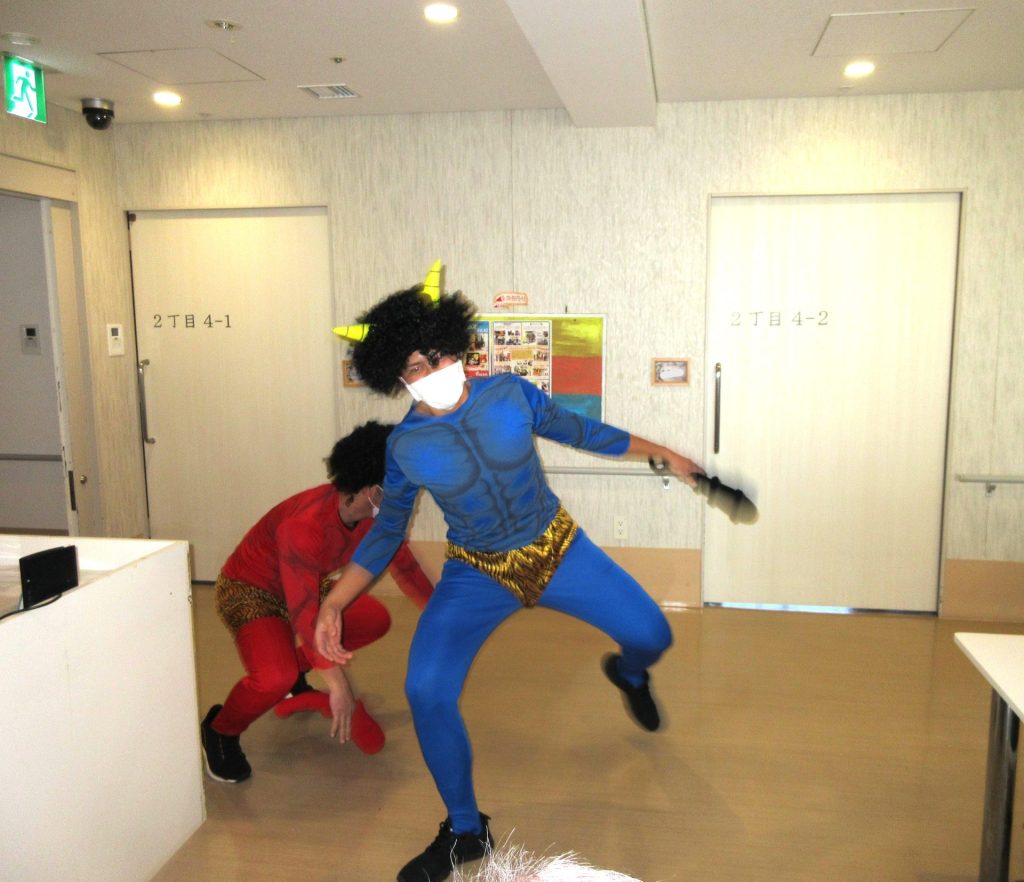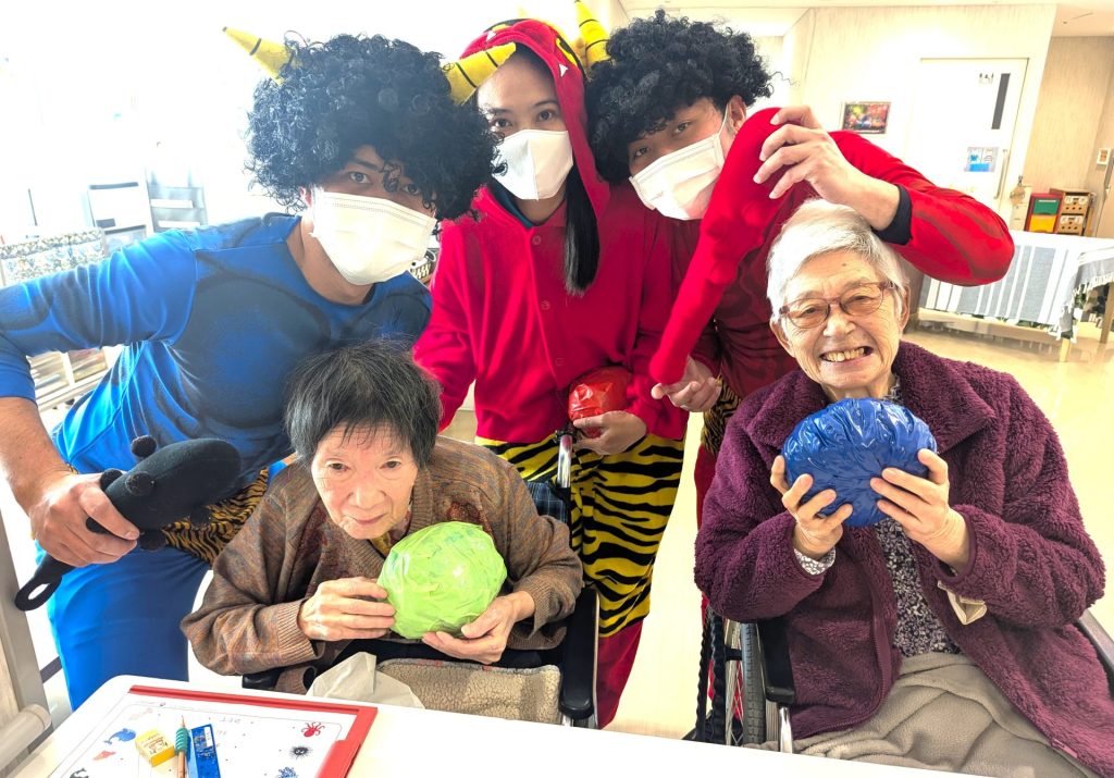 ジョイヴィレッジでは、今年も鬼に扮したスタッフがフロアをまわり、入居者の皆さんに豆に見立てたボールを投げていただき邪気をはらいました。