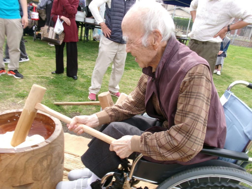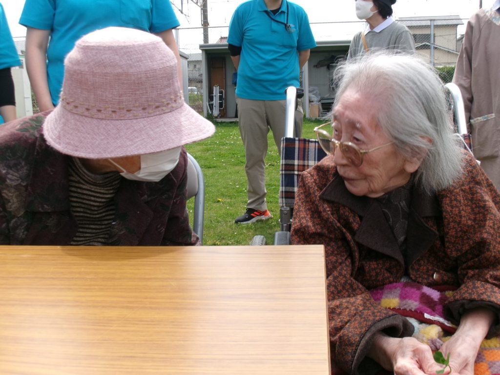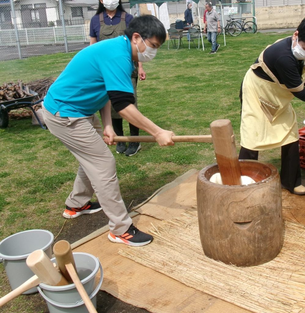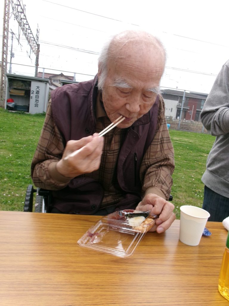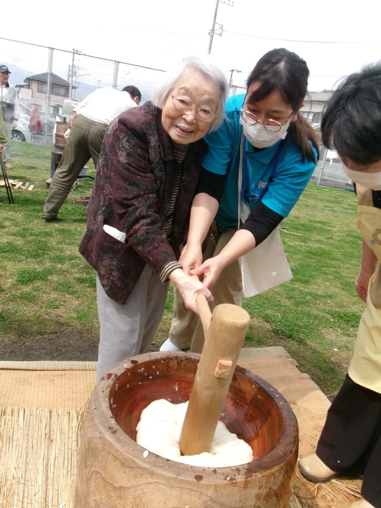 お餅つきにも参加しました!「つきたてのお餅を食べられてしあわせ♬」「昔は家でお餅つきをしていたから懐かしいなあ」などと皆さんおっしゃっていました。桜が満開の中、外でいただくつきたてのお餅は最高です!
