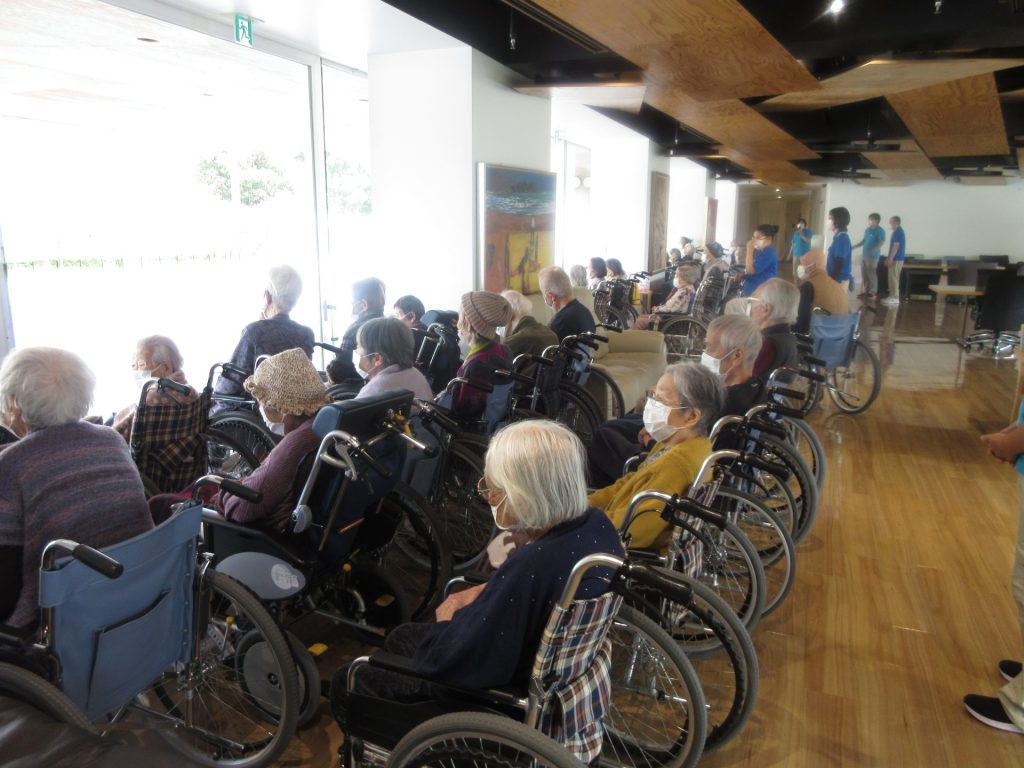 当日は、入居者様も朝から1階エントランスに集まり、子どもたちの到着を今か今かと心待ちにされていました。