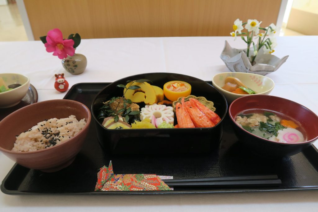 ジュースや甘酒で乾杯!!今年もこうして無事新年を迎えることが出来ました。また、皆さんでお節料理を召し上がりました。心を込めて見た目も美しく華やかに盛り付けられてとても美味しそうです!😊厨房の皆様いつも有難う御座います。♡